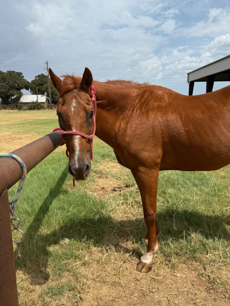 Red is a Quarter Horse gelding who joined our team in 2025. Gentle, willing, and always trying his best, Red has taken to his new career beautifully. He’s a big fan of quality time—especially if it involves curry combs and scratches. With his sweet nature and steady effort, he’s quickly becoming a much-loved member of the Camp Able herd.